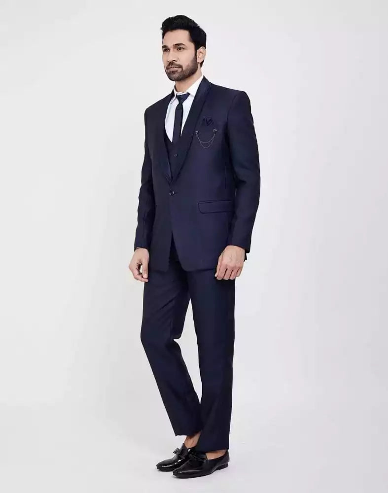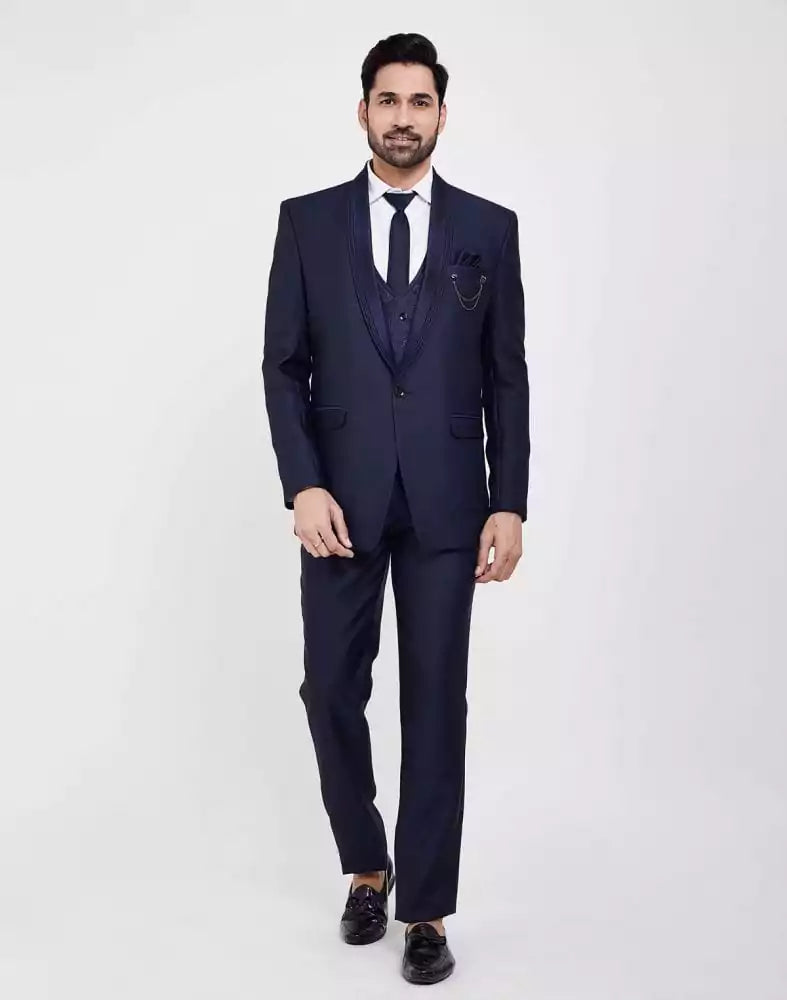 A wedding is a special day for the bride and groom, and the groom's squad should look their best. The navy blue terry rayon waist-satin unstitched pant suit with wine accents is the perfect choice for the dapper gentlemen in the wedding party. The cotton shirt and tie complement the suit perfectly, and the tuxedo 5 pc suit rounds out the look.
