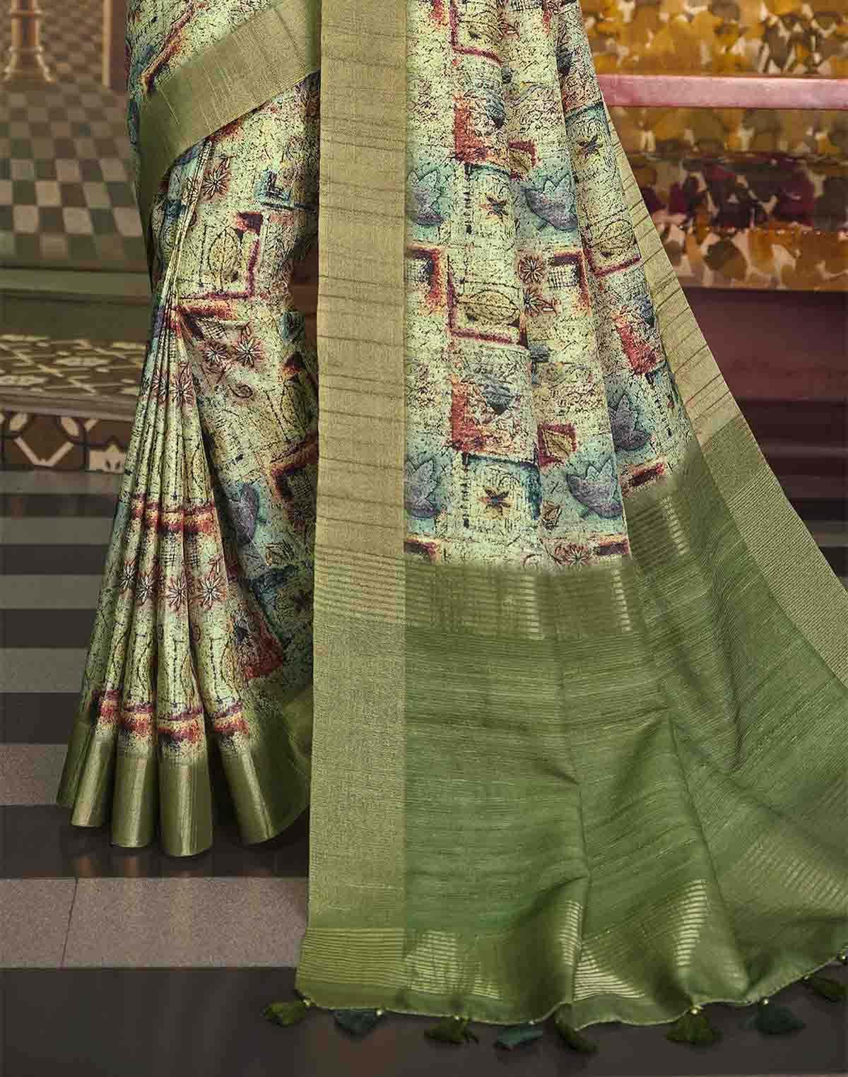 The Olive Green Tussar Silk Graphic Pint Saree features intricate prints on luxurious tussar silk, blending traditional elegance with contemporary design. Its rich texture and vibrant patterns make it a statement piece for any occasion.