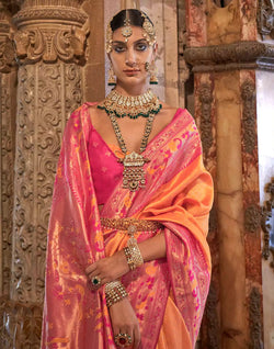 Fill the grace and style in every fold of this orange color saree crafted in banarasi silk. Enhanced using stone work with zari weaving, showcasing distinstive borders and pallu. Paired with a matching pink color blouse.