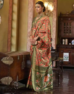 Feel the elegance draped in this beautiful Orange Ikat Print Patola Fancy Saree.