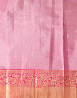 This exquisites silk saree in bright parrot green-pink colour, featuring a floral jaal pattern with gold accents, is perfect for festive and party wear. The saree is accentuated with a small border, adding a touch of elegance.