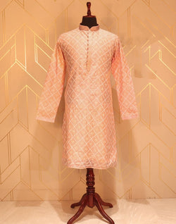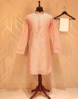 Trendy Peach Geometric Mica Print Paper Silk Kurta Pyjama Set for any small occasion.