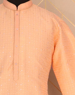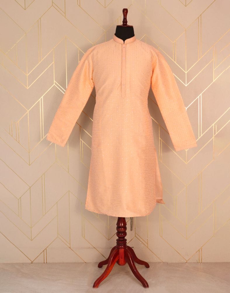 Look handsome and elegant in this Peach Self Design Jacquard Weave Kurta Pyjama Set with pockets on both sides.