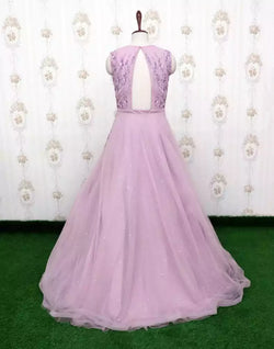 Feel the beauty and elegance in this designer piece gown that is fully flared with a beautiful front and back neck design and with Zip opening on side.