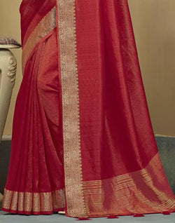 Look beautiful draped in this Raw Silk Plain Red Saree and short pallu with beautified Tussels. Paired with dark green coloured blouse piece.