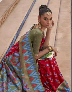 Look like a divine princess on your special day draped in this Red and Green Ikat Print Dola Silk Saree.