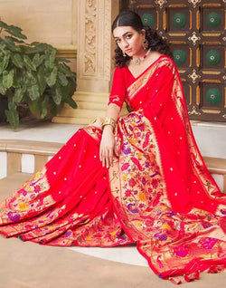 Drape this Red Coloured Plain Banaras Fancy Saree to look elegant and beautiful.