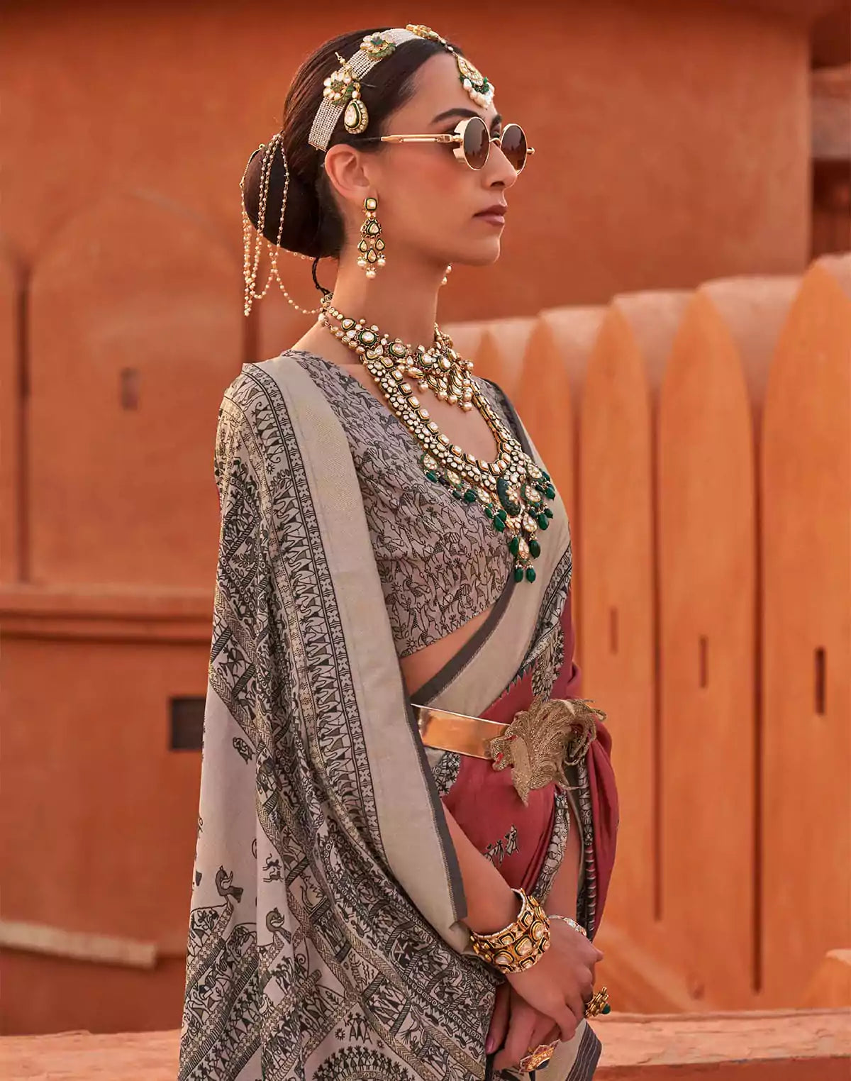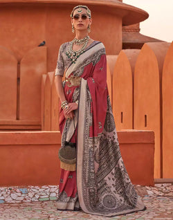 Add a touch of sophistication to your wardrobe with our Red Jute Silk Saree With Madhubani Border and Pallu. Whether you're attending a wedding or a festive celebration, this saree is sure to make you stand out from the crowd. Elevate your style effortlessly with this exquisite piece.
