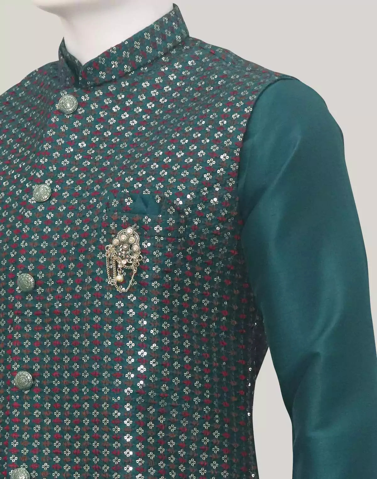 Look like a prince charming in this comfort fit Sequence work Rama Green Raw Silk Kurta Jacket Set.