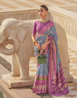Leave a lasting impression on the crowd when you go draped in this beautiful Sky Blue Ikat Print Patola Saree.