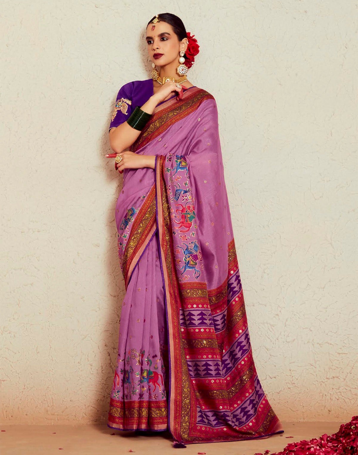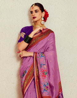 A soft Brasso saree in elegant lavender, adorned with intricate purple embroidery. The fabric drapes gracefully, enhancing the rich detailing. Paired with a matching purple embroidered blouse for a refined, sophisticated look.