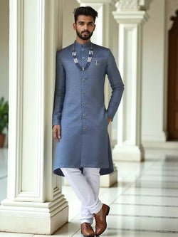 Atrractive Steel Grey Floral Design Jacquard Semi-Indo Set features intricate floral patterns woven into luxurious fabric. The rich jacquard texture adds a touch of elegance, while the semi-Indo design offers a contemporary yet traditional appeal. Ideal for festive occasions, this set combines comfort and style effortlessly.