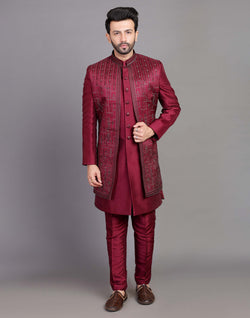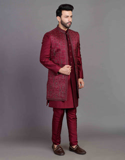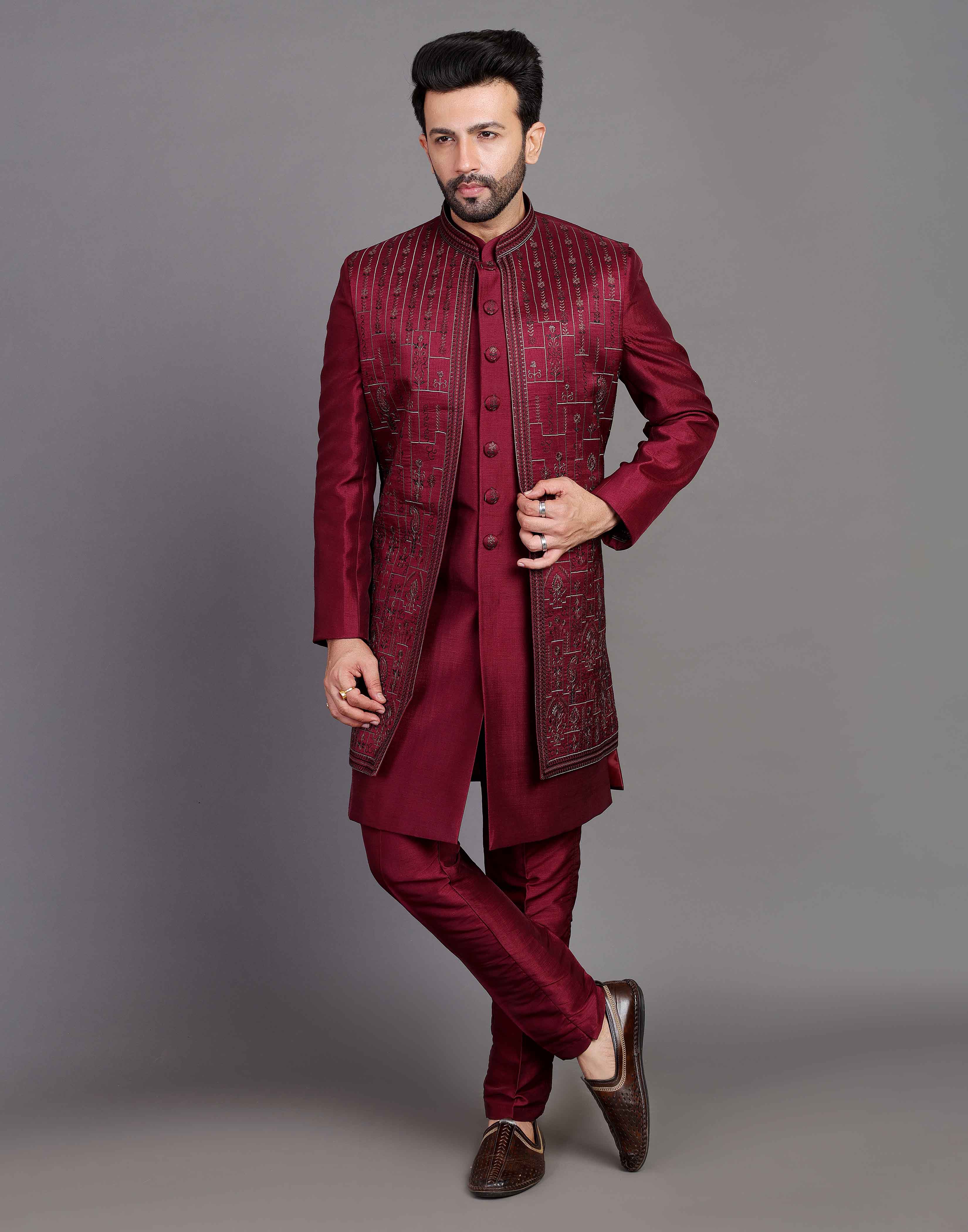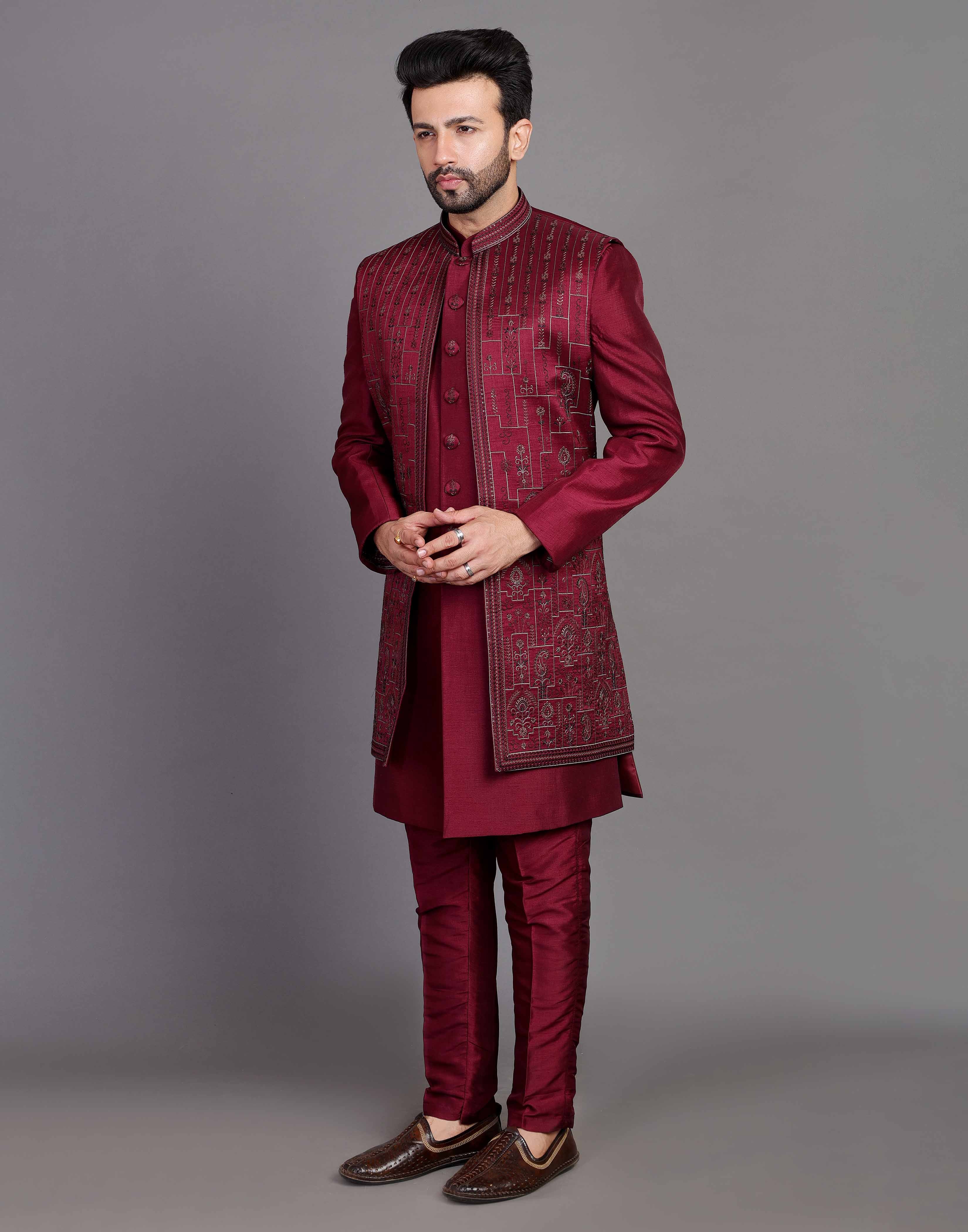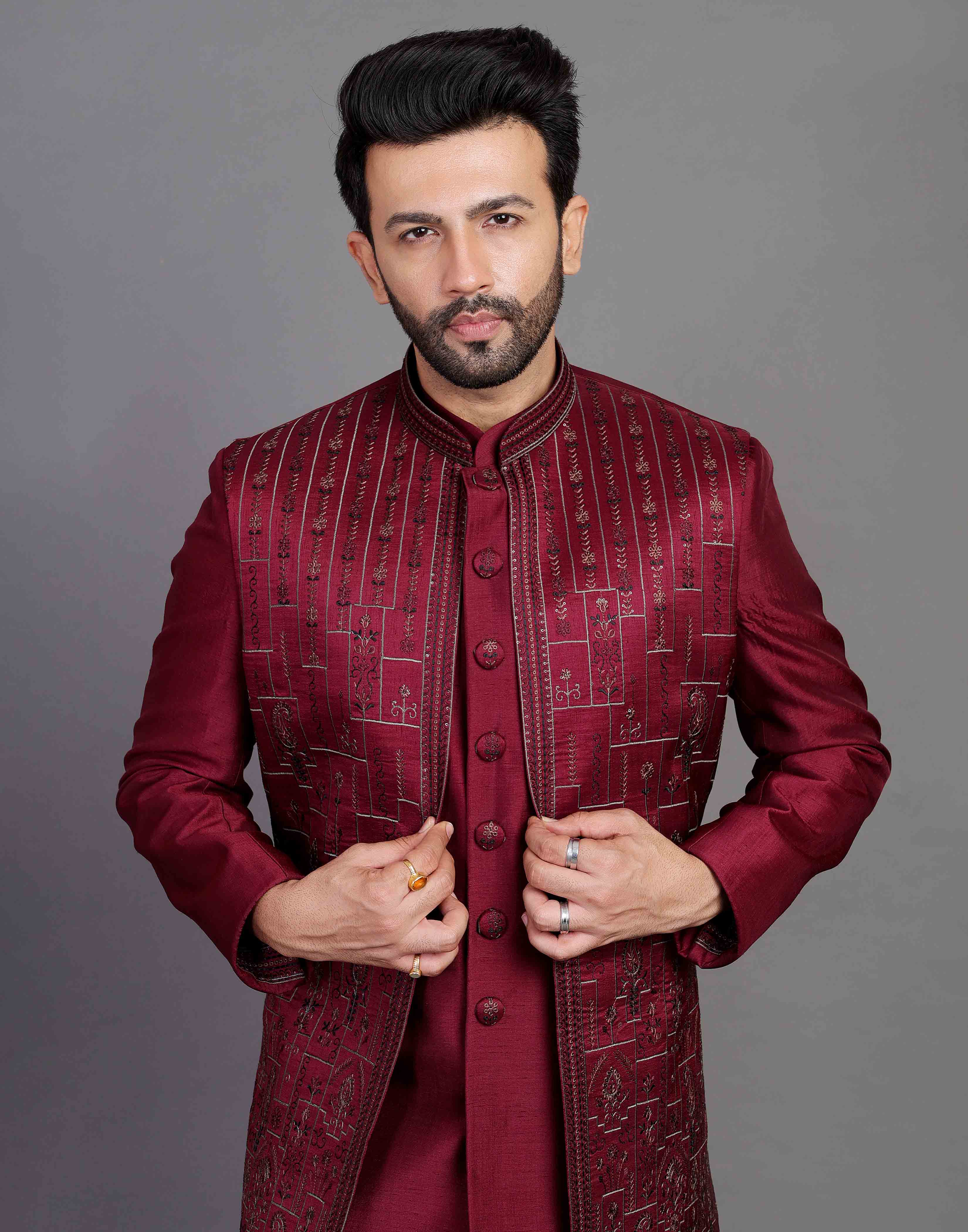 A stylish maroon-colored raw silk open jacket featuring intricate embroidery work. The delicate hand-embroidered designs add a luxurious touch, making it perfect for elegant occasions. This chic, open-style jacket combines traditional craftsmanship with modern fashion flair.