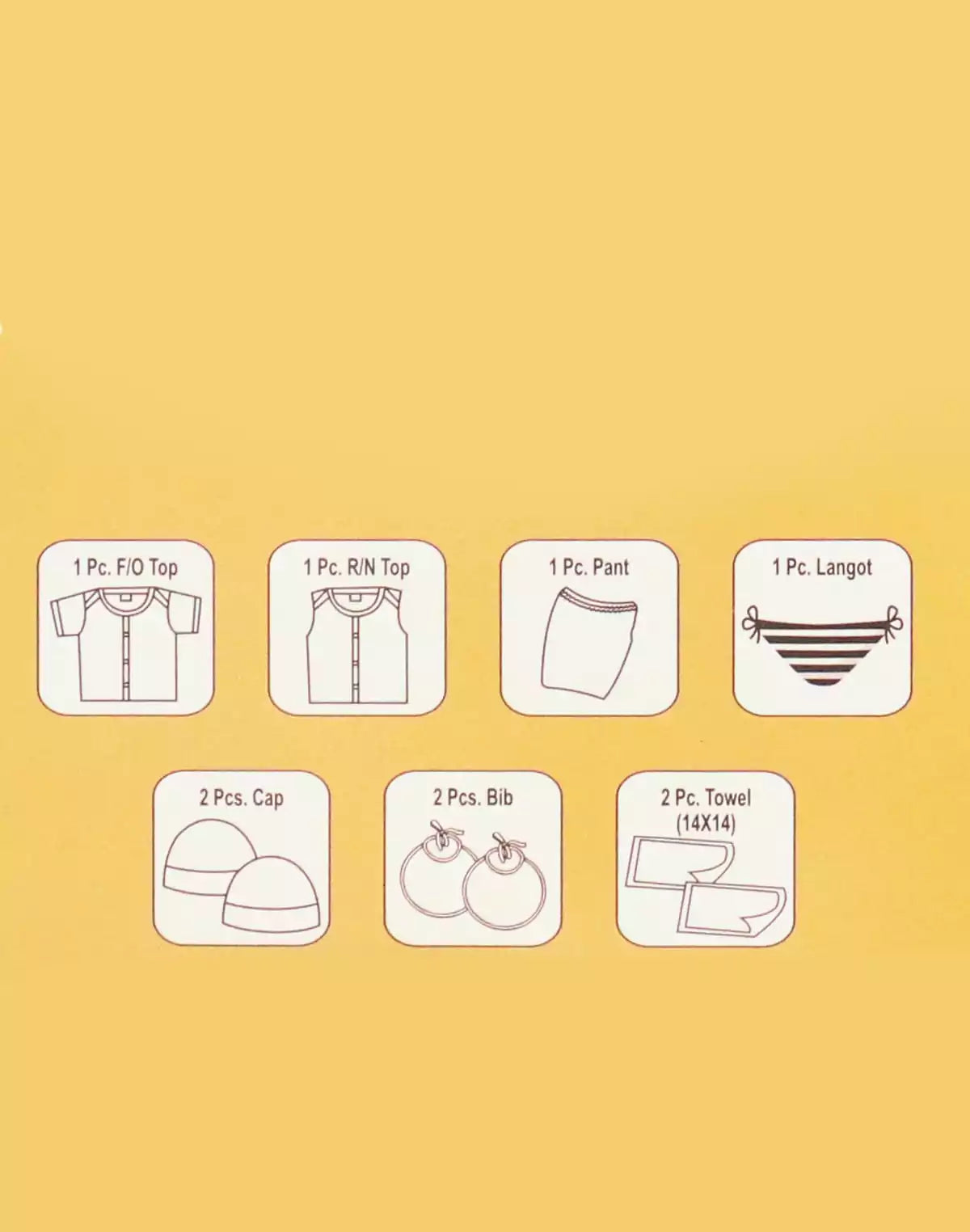 F/O Top-1, R/N Top-1, Pant-1, Langot-1, Cap-2, Bib-2, Towel-2