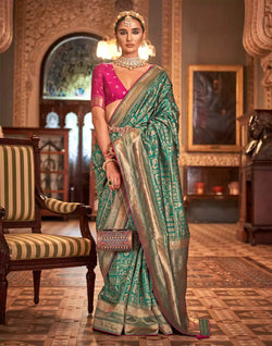 Stand out in the crowd with our stunning Teal Green Banaras Silk Saree. The intricate Novelty Pattern adds a modern touch to this classic ensemble, complemented by a beautiful pink color butta blouse for a pop of color.