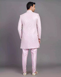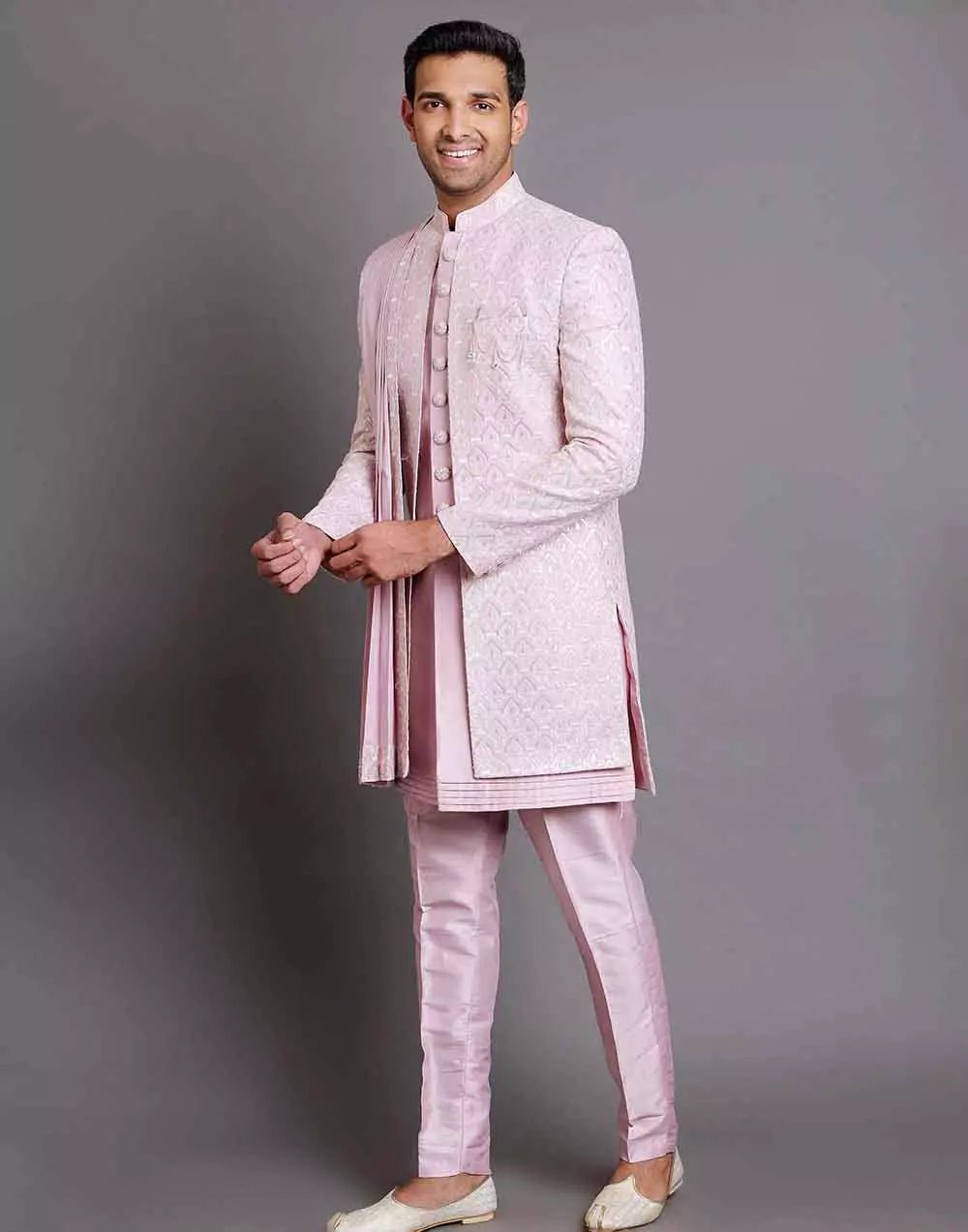 All Over Floral Thread and Embroidery Indo Open Style features intricate threadwork with a subtle self-design pattern on raw silk fabric. It is enhanced with Embroidery for a touch of elegance and showcases an open-front design typical of traditional Indo-western fusion styles. This ensemble combines classic craftsmanship with modern flair for a sophisticated and versatile look.