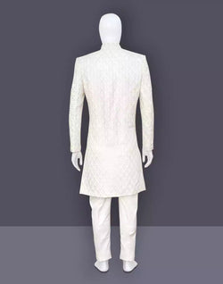 Shine bright in this stunning White Sequins work Milky Silk Indo Western Set from Self Design. With its luxurious fabric and intricate details, you'll be sure to turn heads at any event. Complete the look with the included mala and white pyjama for a truly show-stopping ensemble. Step out with confidence and style in this statement outfit that is bound to make you stand out from the crowd.