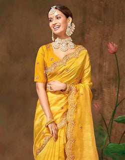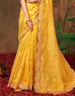 Simple yet fashionable yellow checkered embroidery work organza saree suitable for any small occasions.